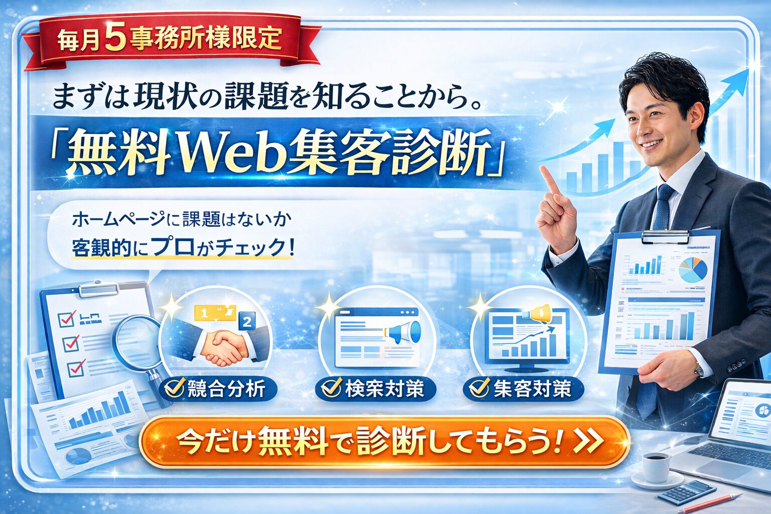 必要以上の売り込みを前提とした無料診断ではありません。まずは士業事務所やコンサル会社のホームページの現状を把握し、Web集客や問い合わせ導線の課題を整理することを目的としています。現在の課題を確認したい、LPやコラム施策の必要性を見極めたいという段階でも利用しやすく、無理な営業なくご相談いただけます。